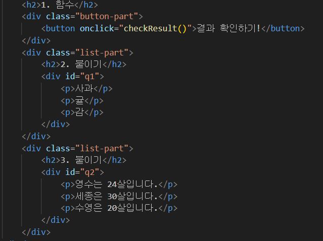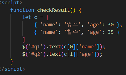 EX1) 결과 확인하기! 버튼을 누르면 2.리스트 밑에 영수가, 3.딕셔너리 밑에 35가 출력되게 해보시오.