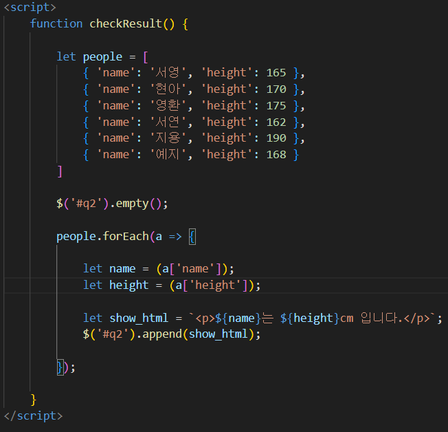 EX2) 결과 확인하기! 버튼을 누르면 3. 붙이기 밑에 글들이 없어지고, people list로 "~~는 ~~cm 입니다." 가 출력되게 시오.