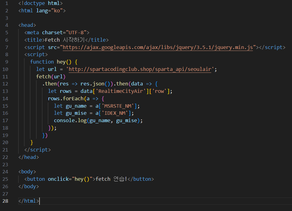 "fetch 연습!" 버튼을 누르면 console 창에 각 지역과 미세먼지 정도를 나열하시오.