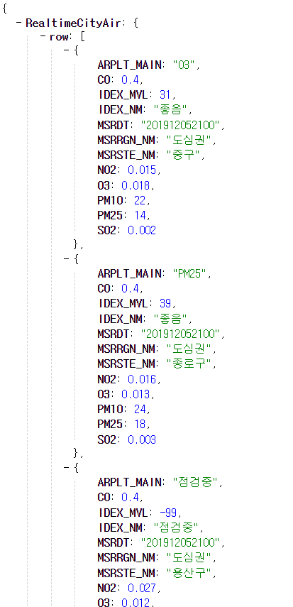 ㄴ RealtimeCityAir이라는 딕셔너리 안에 > row 라는 리스트 안에 MSRSTE_NM 값과 IDEX_NM 값