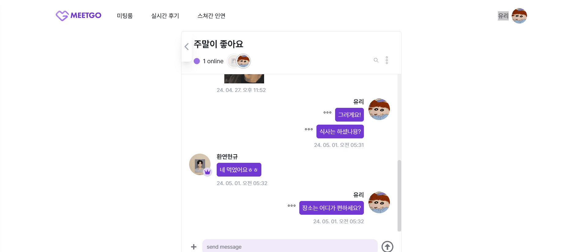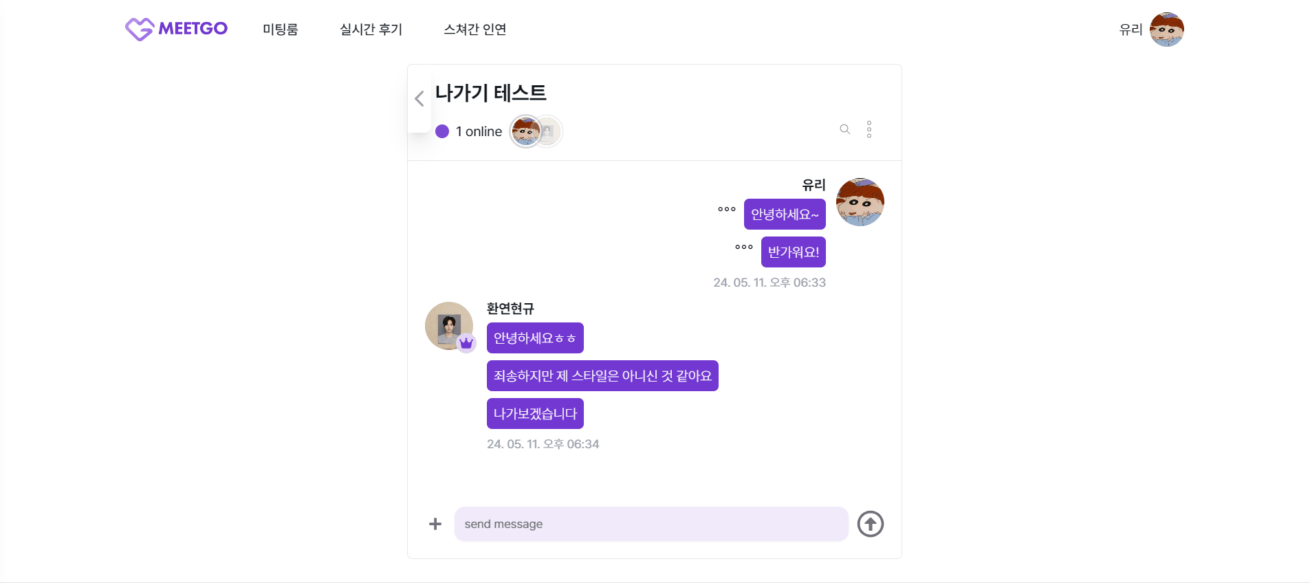 => ํ ๋ช ์ด๋ผ๋ ๋๊ฐ๋ฉด ํด๋น ์ฑํ ๋ฐฉ์ ์ข ๋ฃํด๋ฒ๋ฆฌ์! ์๋ก ๋๊ตฐ๊ฐ ๋ค์ด์ค๋ฉด ์๋ก์ด ์ฑํ ๋ฐฉ์ ์์ํ์.