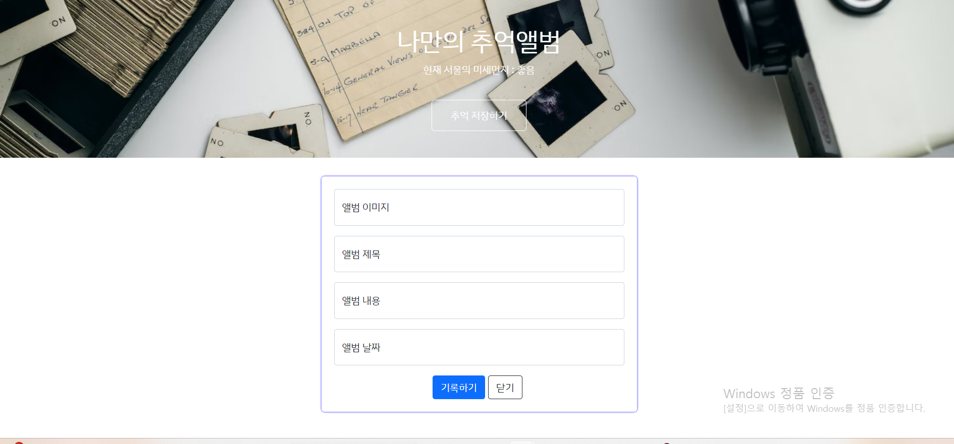 > 나만의 추억앨범 페이지의 기록하기 버튼을 누르면 카드의 내용이 Firebase에 저장되고, 저장완료! 메세지와 새로고침이 되도록 하시오.