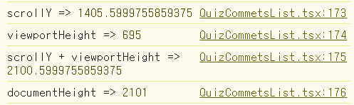 scrollY + viewportHeight ๊ฐ documentHeight์ ๊ฑฐ์ ๋น์ทํ ์ซ์๊ฐ ๋์๋ค. ํด..