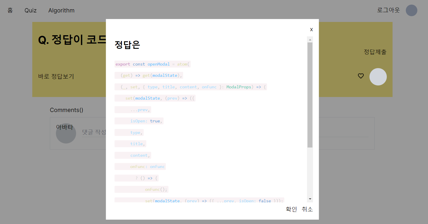 (2) 전역 상태관리로 모달 open이 true가 되면 Modal 컴포넌트를 렌더링 시킨다.