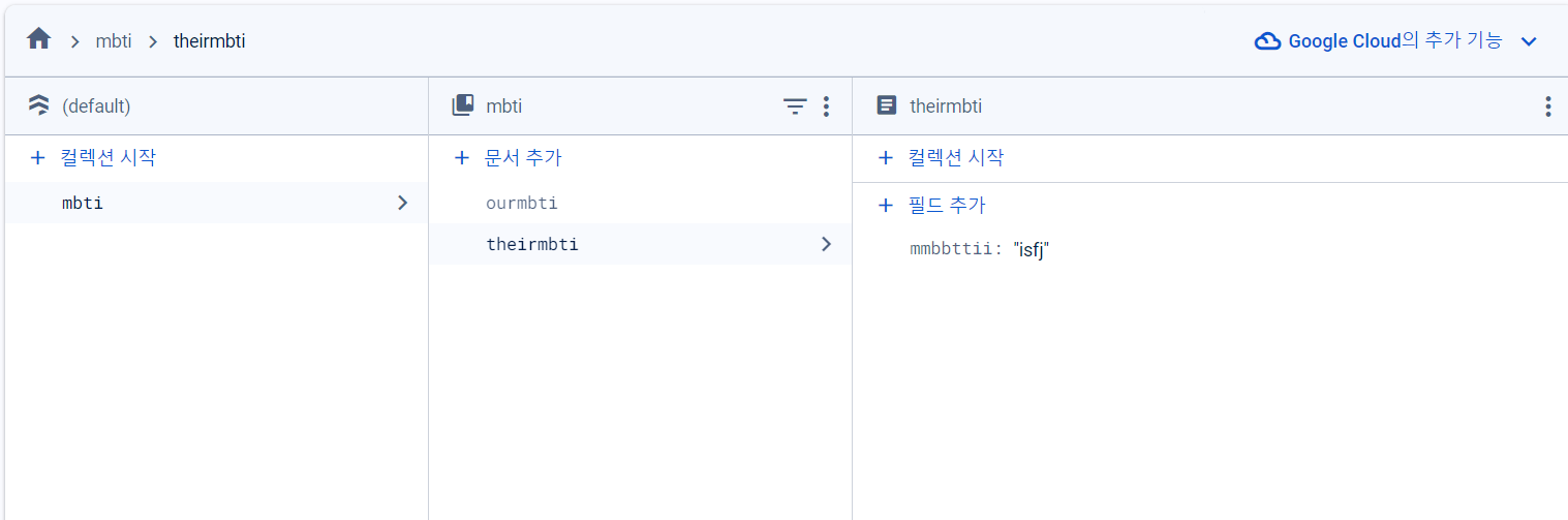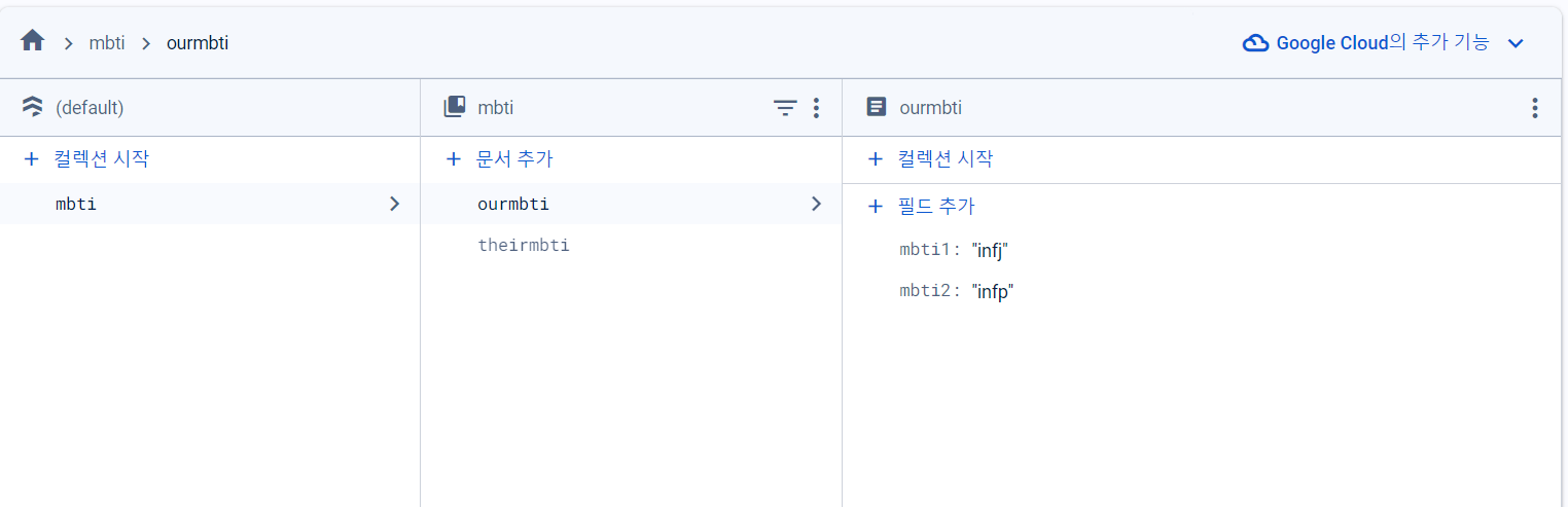 예시로 Firebase에 mbti라는 하나의 컬렉션 안에 ourmbti 와 theirmbti 라고 두 개의 문서를 만들어봤다.